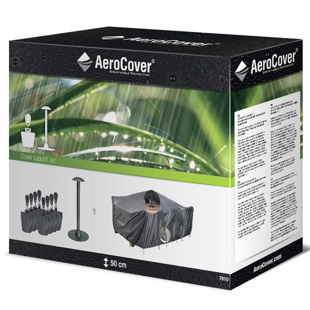 De AeroCover Hoessteunset bestaat uit acht zandzakjes en een in hoogte verstelbare hoessteun van maximaal 50 centimeter hoog. De hoessteun wordt onder een tuin- of loungemeubelhoes geplaatst waardoor ophoping van vuil en water wordt voorkomen. De 8 zandzakjes die erbij geleverd worden kunnen aan de hoes worden bevestigd, door het extra gewicht dat aan de hoes hang wordt deze mooi op zijn plaats gehouden.