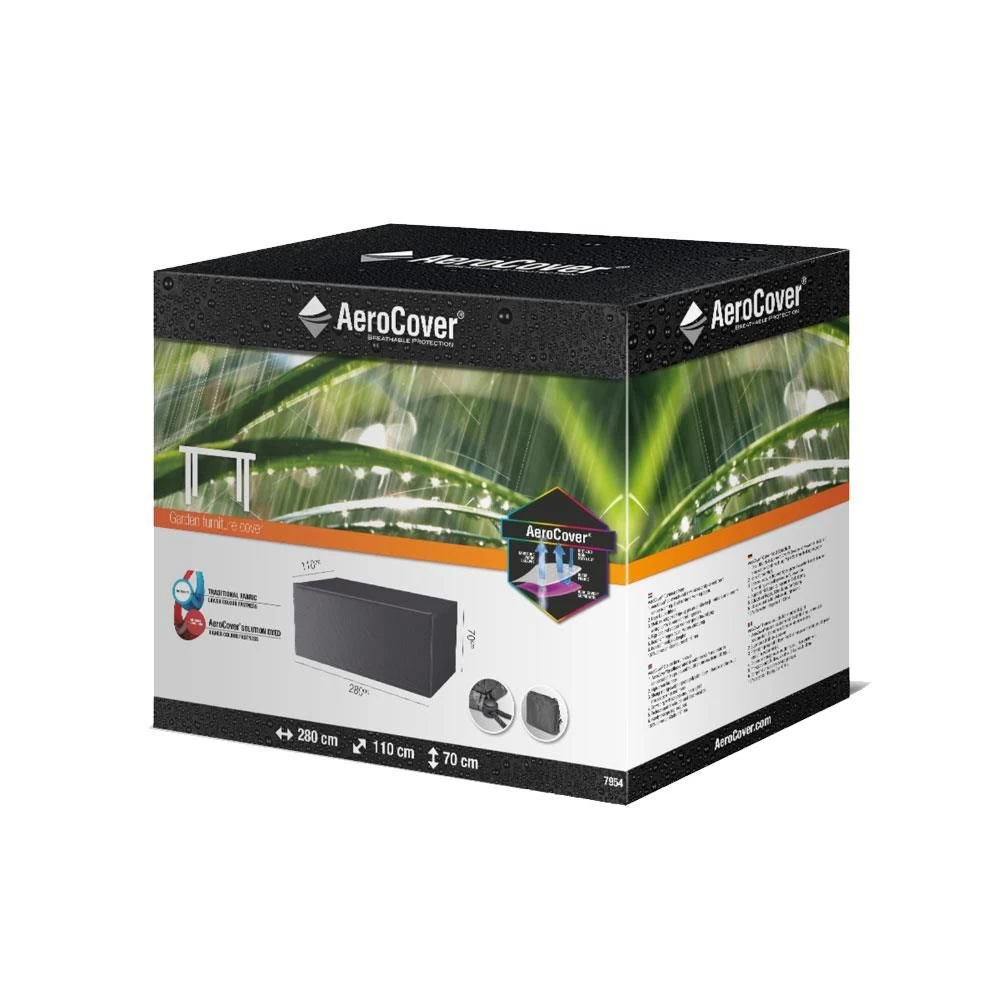 De AeroCover Tuintafelhoes 280 x 110 x 70 antraciet is geschikt voor rechthoekige tafels van 260 tot 280 cm. Het sterke en lichtgewicht ripstop polyester is makkelijk hanteerbaar. De ademende stof is waterbestendig, reduceert condensvorming en gaat schimmelvorming tegen. Voor een goede bevestiging heeft de tuintafelhoes een rijgkoord met twee stoppers. De hoes wordt inclusief handige opbergtas geleverd.