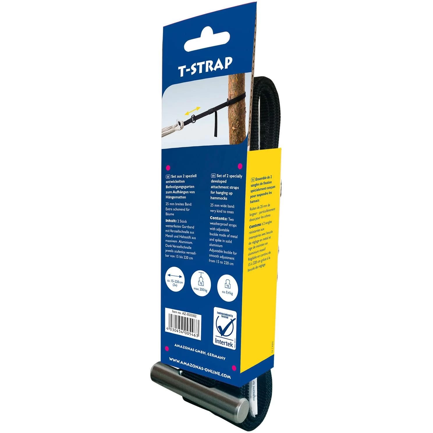 Met de Amazonas T-Strap hangmatbevestiging kunt u uw hangmat vastmaken aan een boom. De banden van de Amazonas hangmatbevestiging is extra breed, waardoor deze niet in de bast van de boom snijdt. De lengte van de twee banden zijn verstelbaar van 15 tot 220 cm.