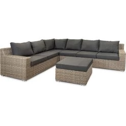 De Bardani Vivaldi loungeset is gemaakt met een wicker bekleding en het frame is gemaakt van aluminium. Deze loungeset bestaat uit twee banken, een hocker, een hoekdeel en een tussendeel. Bij de loungeset krijgt u comfortabele zit- en rugkussens. De loungeset heeft een afmeting van 325 centimeter bij 255 centimeter en is ideaal voor 5 personen.