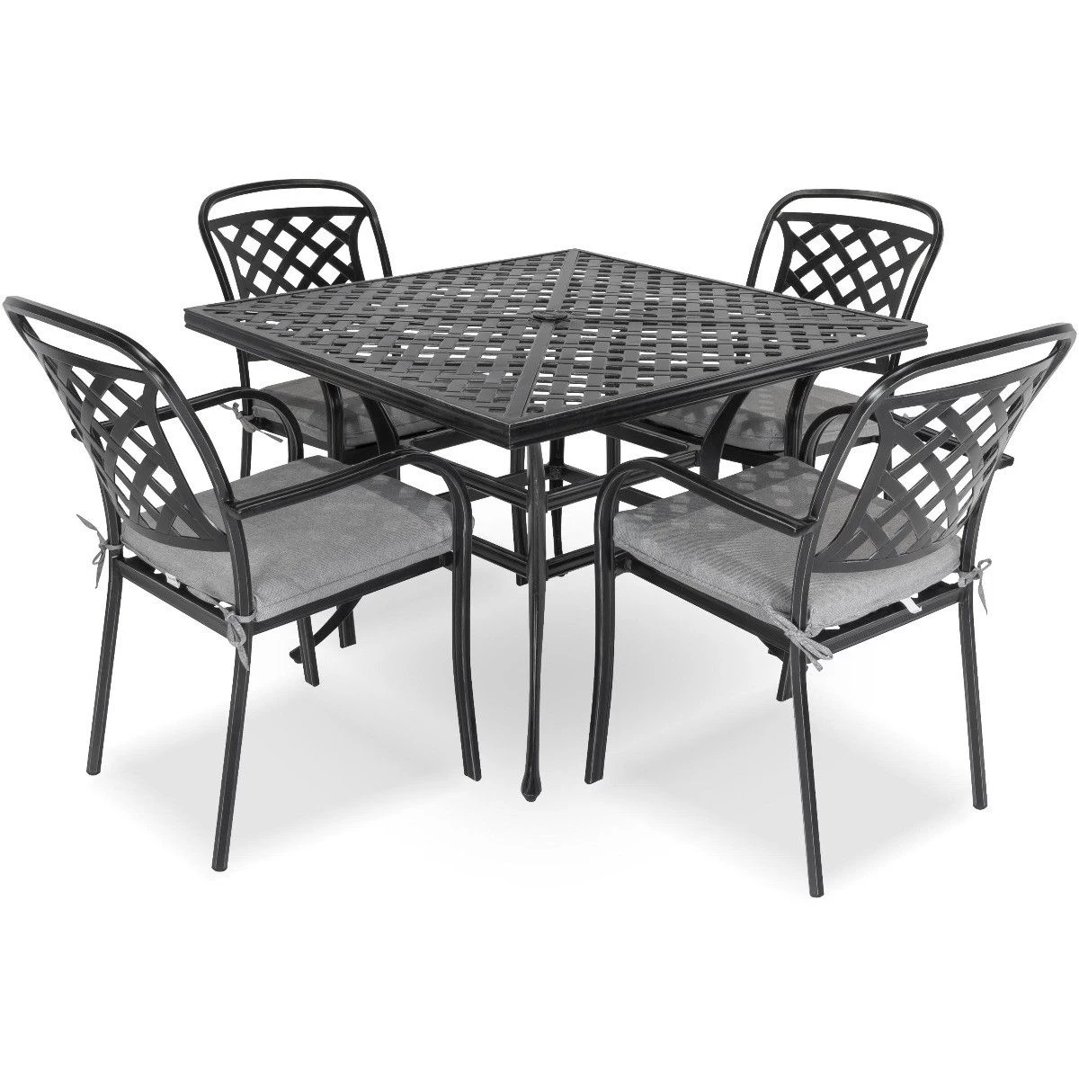 De tuintafel bestaat uit aluminium en heeft een patroon met vierkanten in de tafel. Dit geeft de tafel een stevig en toch modern uiterlijk. Het aluminium is licht van gewicht en dus kunt u de tafel makkelijk verplaatsen.
