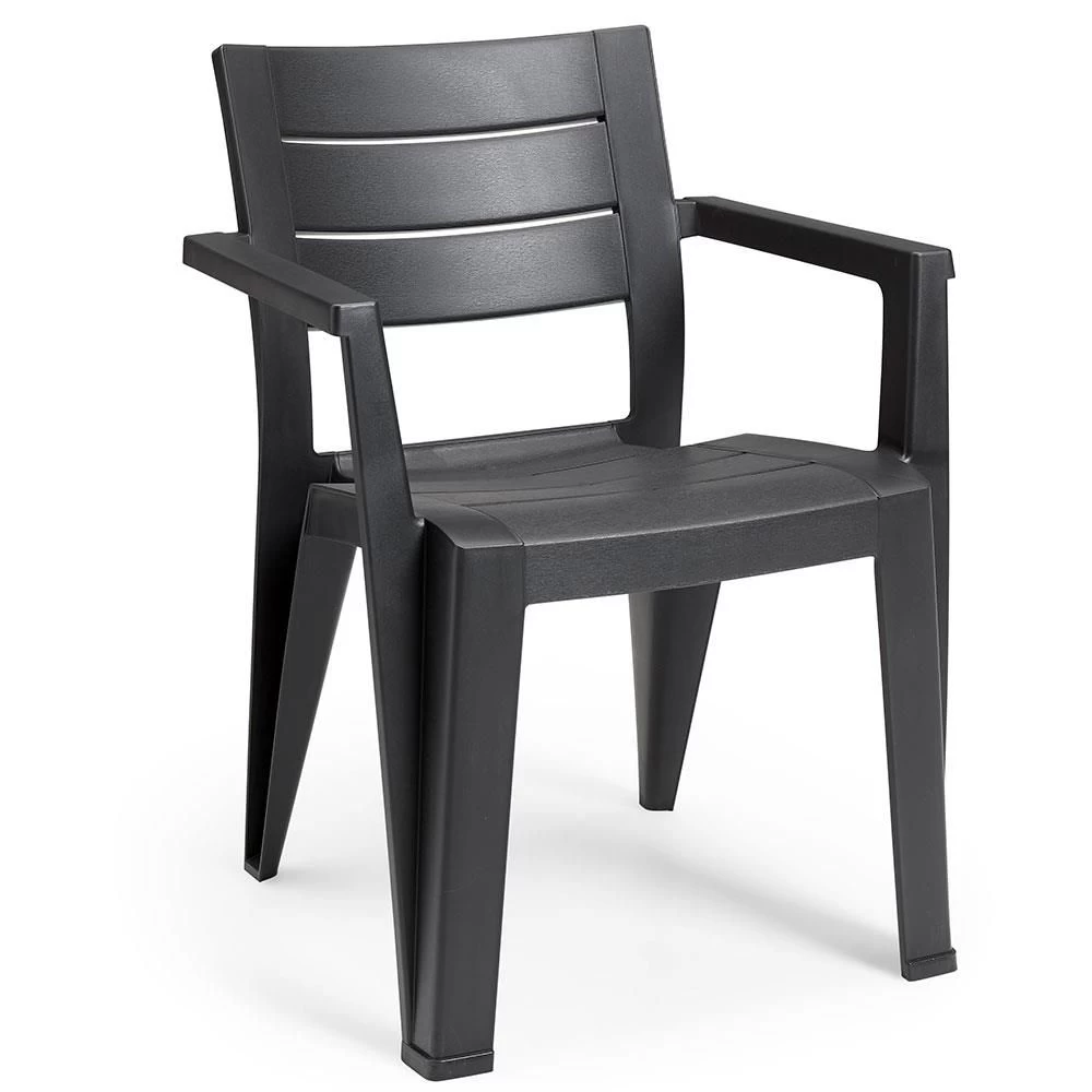 De Keter Julie stapelbare tuinstoel in de kleur graphite heeft een hoog zitcomfort. Deze tuinstoel van Keter is gemaakt van duurzaam kunststof en heeft een houtlook afwerking. Verder is de stoel onderhoudsvrij en weerbestendig.