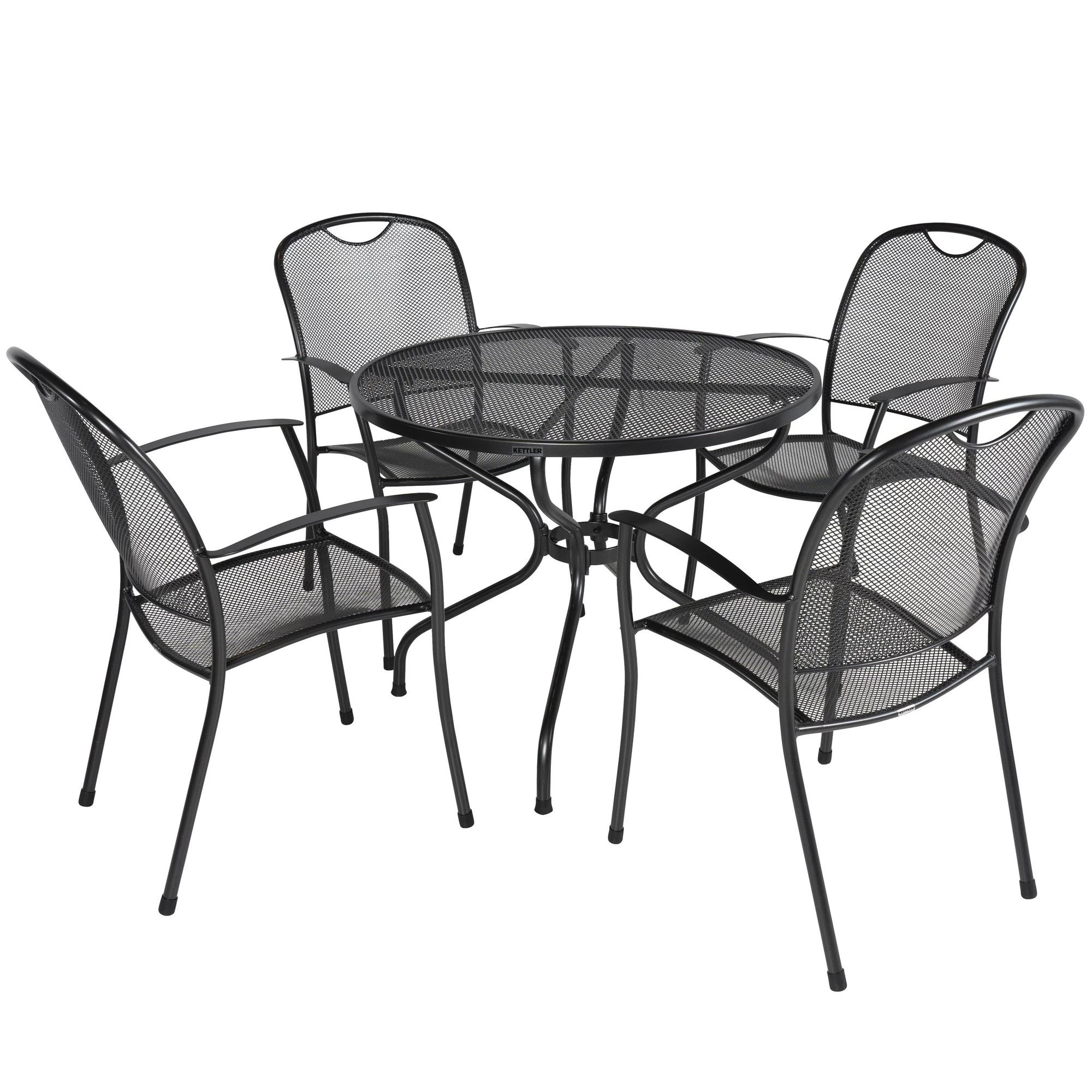 De Kettler Strek 90 Kos tuinset is een degelijke, weerbestendige en onderhoudsvriendelijke tuinset. De set bestaat uit vier stapelbare Terraza tuinstoelen en een bijpassende, ronde tafel met een doorsnede van 90 cm. Zowel de stoelen als de tafel zijn gemaakt van staal en sierlijk strekmetaal, afgewerkt met een beschermende Kettlotherm coating. Door de stapelbare stoelen is de Terraza set eenvoudig op te bergen maar kan ook het hele jaar buiten blijven staan. Het is dan wel verstandig de set te behandelen met autowas om eventuele beschadigingen die door het gebruik zijn ontstaan te beschermen tegen roest.